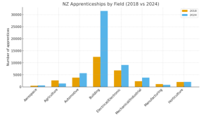 How does New Zealand compare? Apprenticeships here remain concentrated in traditional trades. The data tells an important story. Below is a snapshot of selected fields in 2018 and 2024, followed by a chart that visualises the shifts.